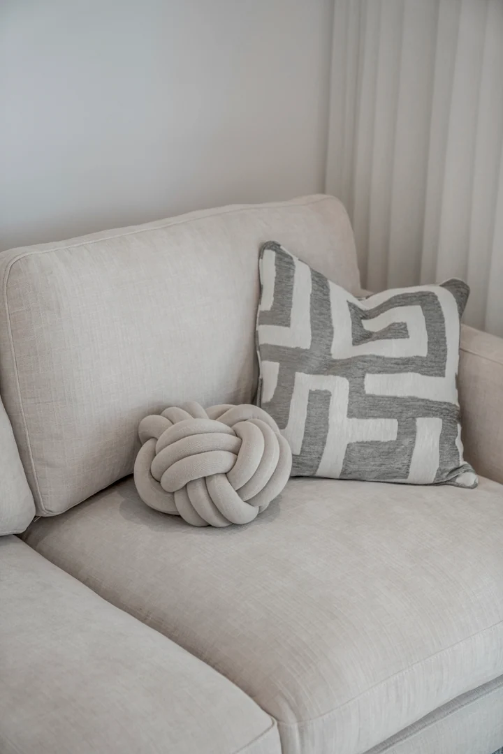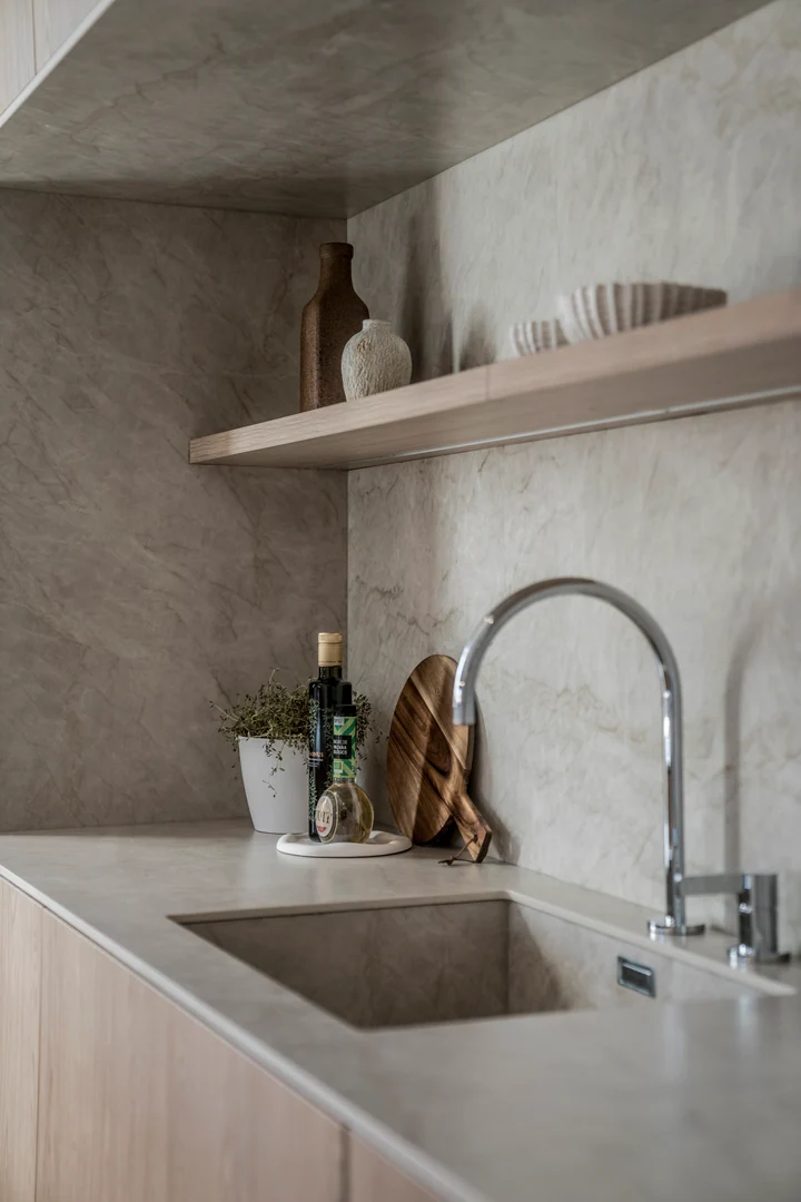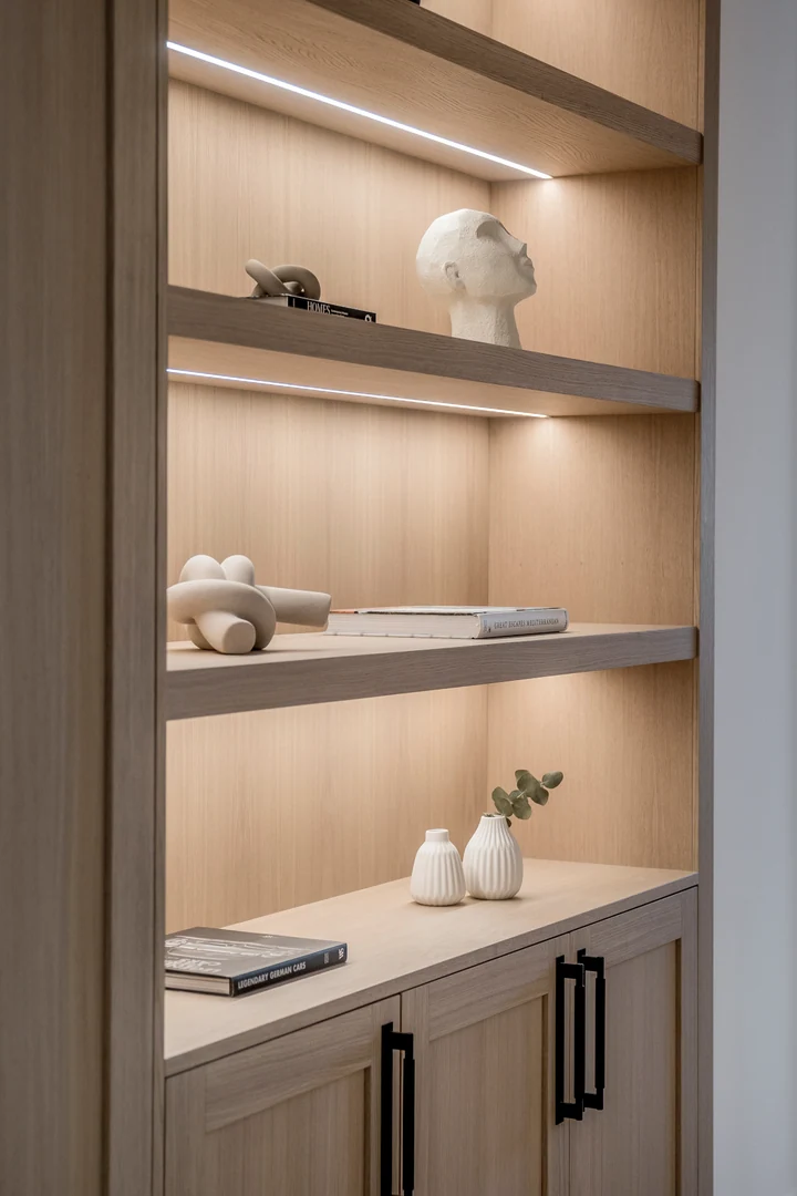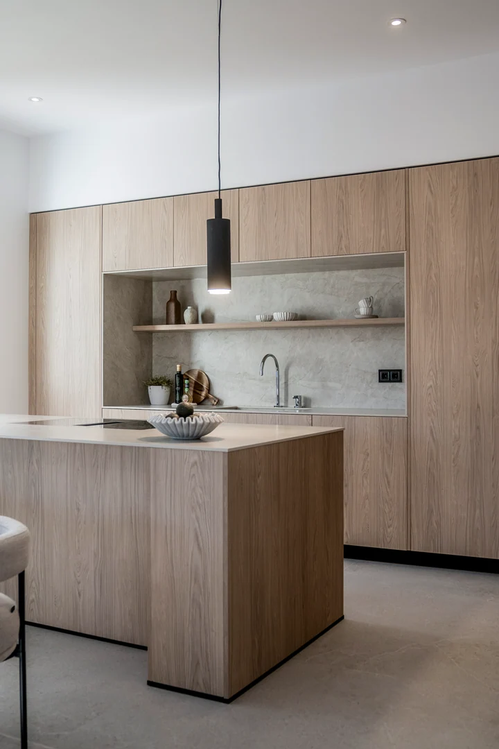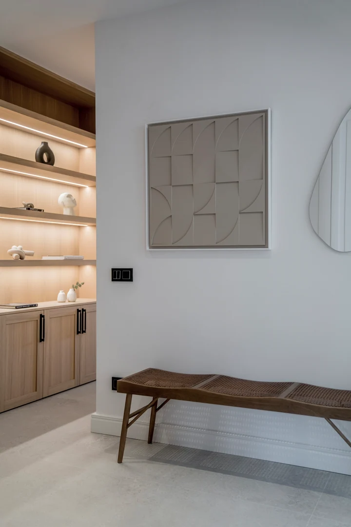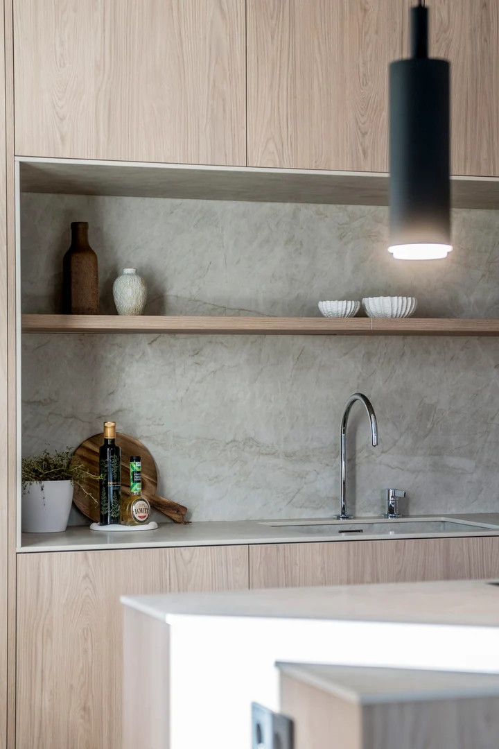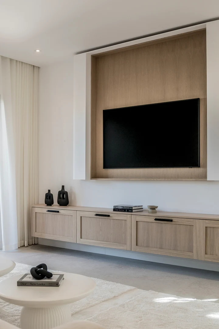 Entering the living area, you are greeted by a bespoke kitchen that exudes both elegance and functionality. It features stunning deep wooden accents on the island and cupboards, complemented by a soothing ‘Taj Mahal’ marble countertop. With ample storage, generous counter space, and a wine cooler, it is a modern kitchen that is incredibly functional for those who enjoy cooking and gatherings. The living room area is warm and inviting, featuring a majestic TV-wall with a spacious bench that offers ample storage.