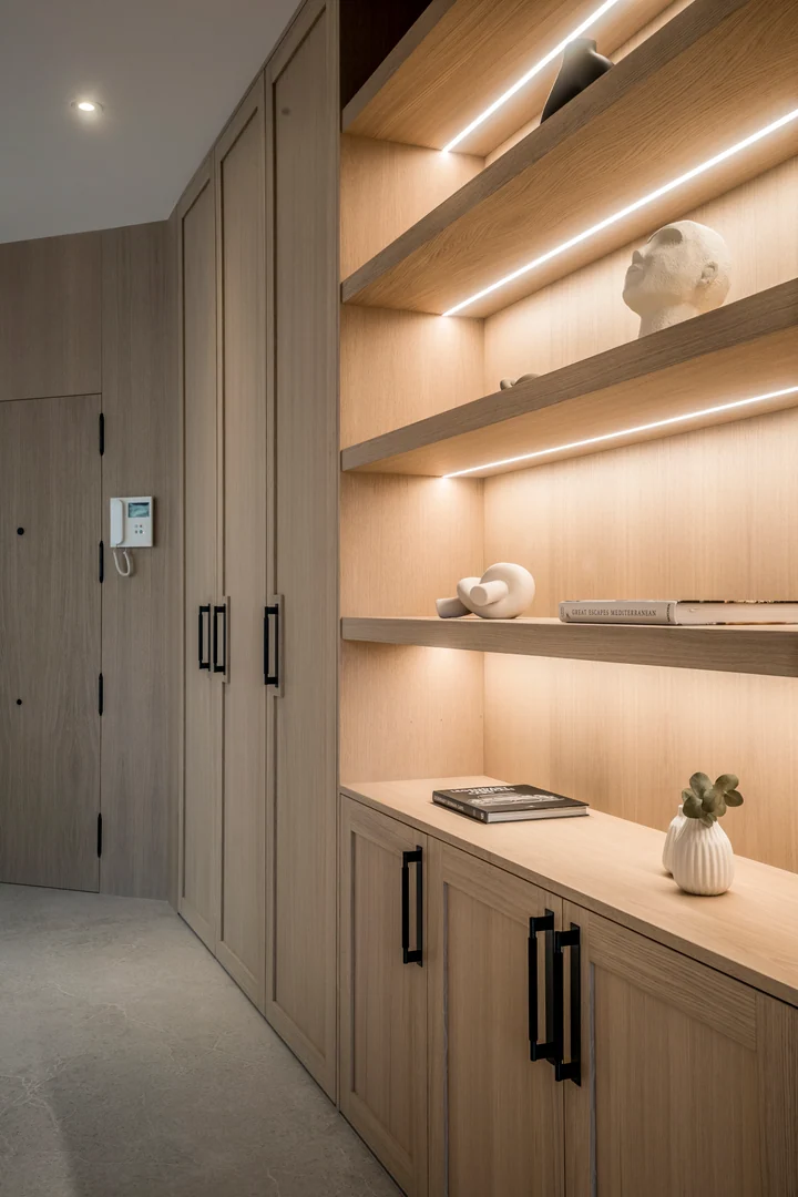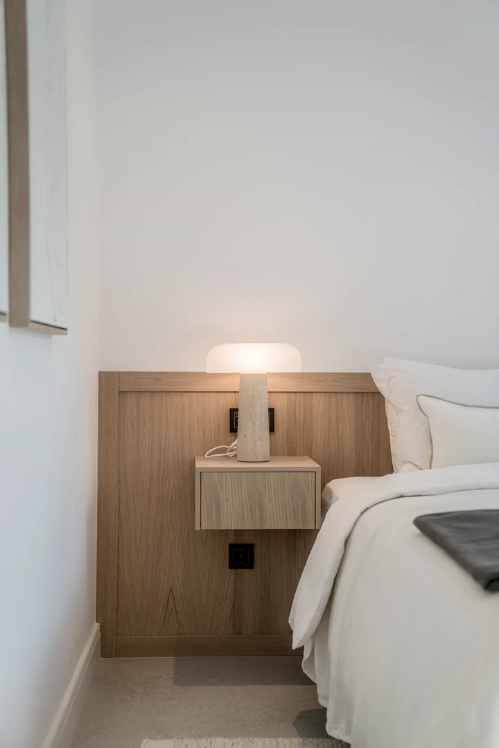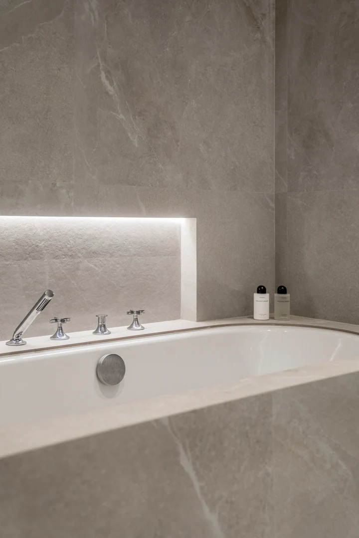 The three bedrooms are refined and sophisticated, featuring wooden accents, bespoke wardrobes, and flattering LED lighting throughout. The elegantly decorated bathrooms are crowned with luxury showers and faucets from Dornbracht, where the grand master bathroom is completed with a bathtub and double vanity.